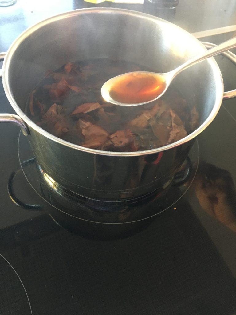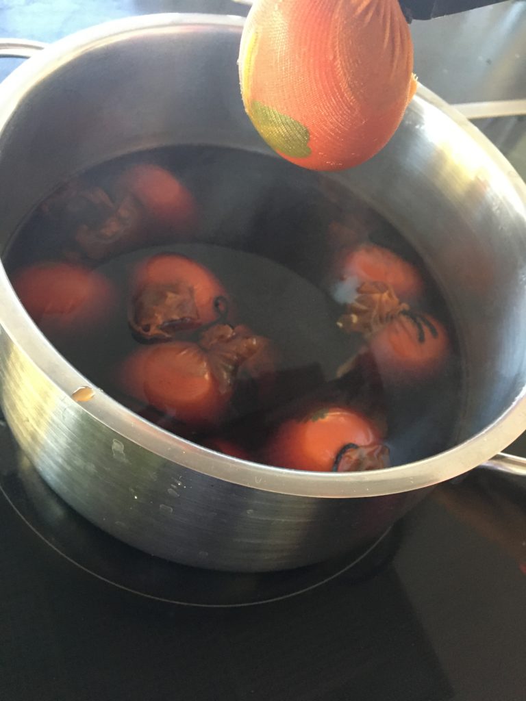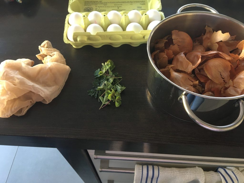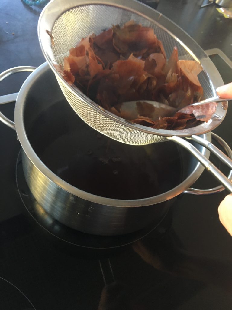 Do this with all your eggs. Let the onion skin in the cooking water for about 15 min to get all the colour out of the skin. After this take a sieve and screen out the onion skin.