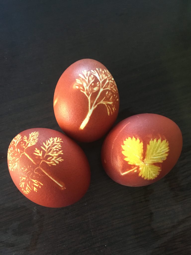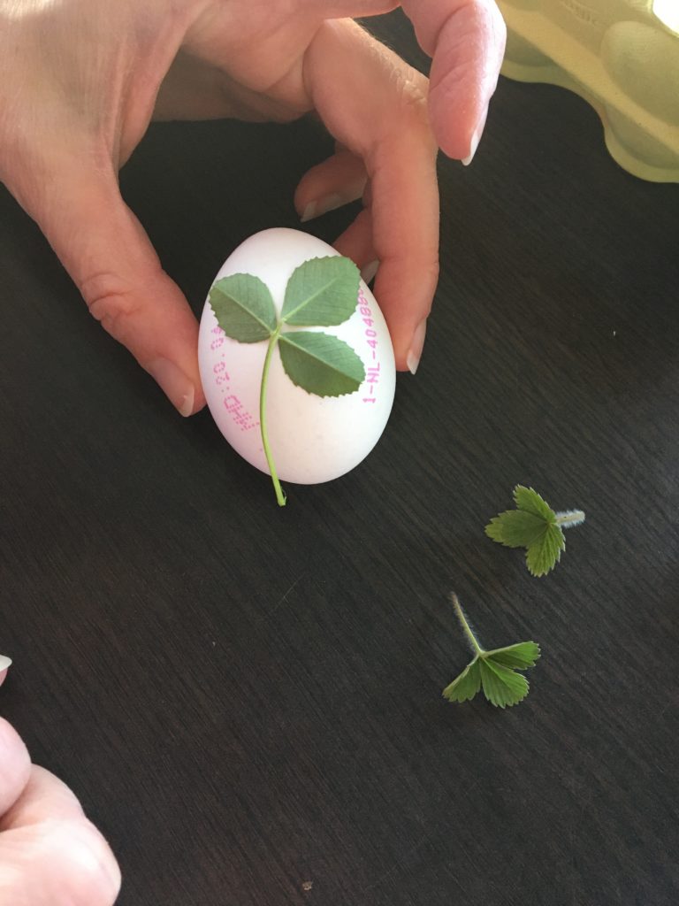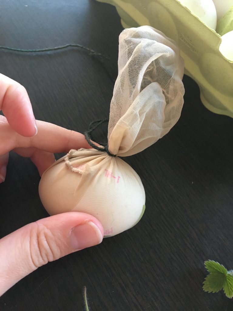 While you are waiting for the water to cook, you take an egg and put one plant leave on it. Beware that the leave lies with the face-side on the egg. Then you take the nylon stocking and strech it over the egg like this…..
